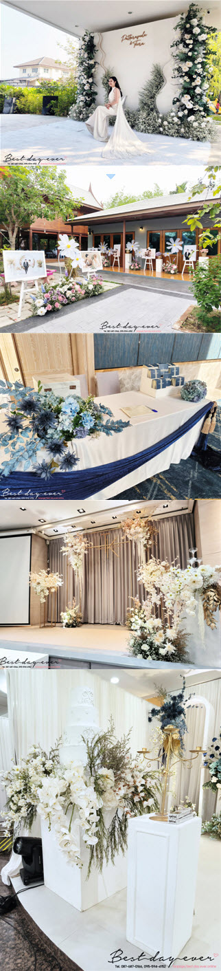 - ผ้าและดอกไม้ตกแต่งโต๊ะลงทะเบียนตามธีมงาน